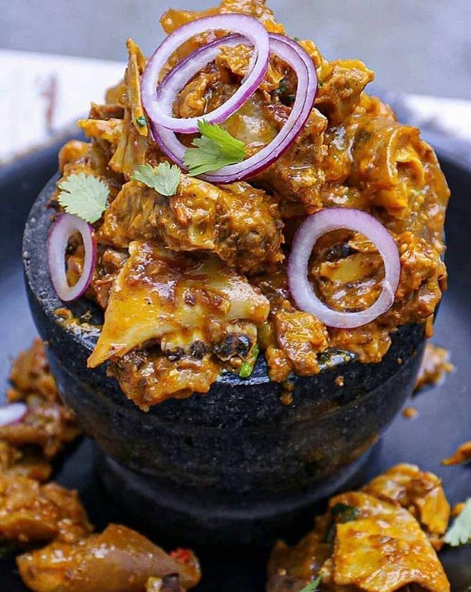 A spicy, flavorful goat head delicacy cooked with rich palm oil sauce and traditional African spices.